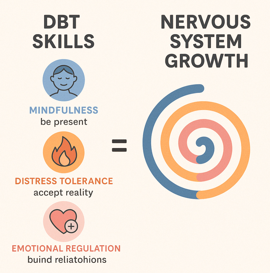 DBT offers a lot of options for engaging in this process to build a healthier nervous system. So, I thought it would be great if we all got a crash course in what exactly DBT is so we can all understand how it can be effective for us, even if we’re not in a traditional DBT program, or not engaging in therapy at all.