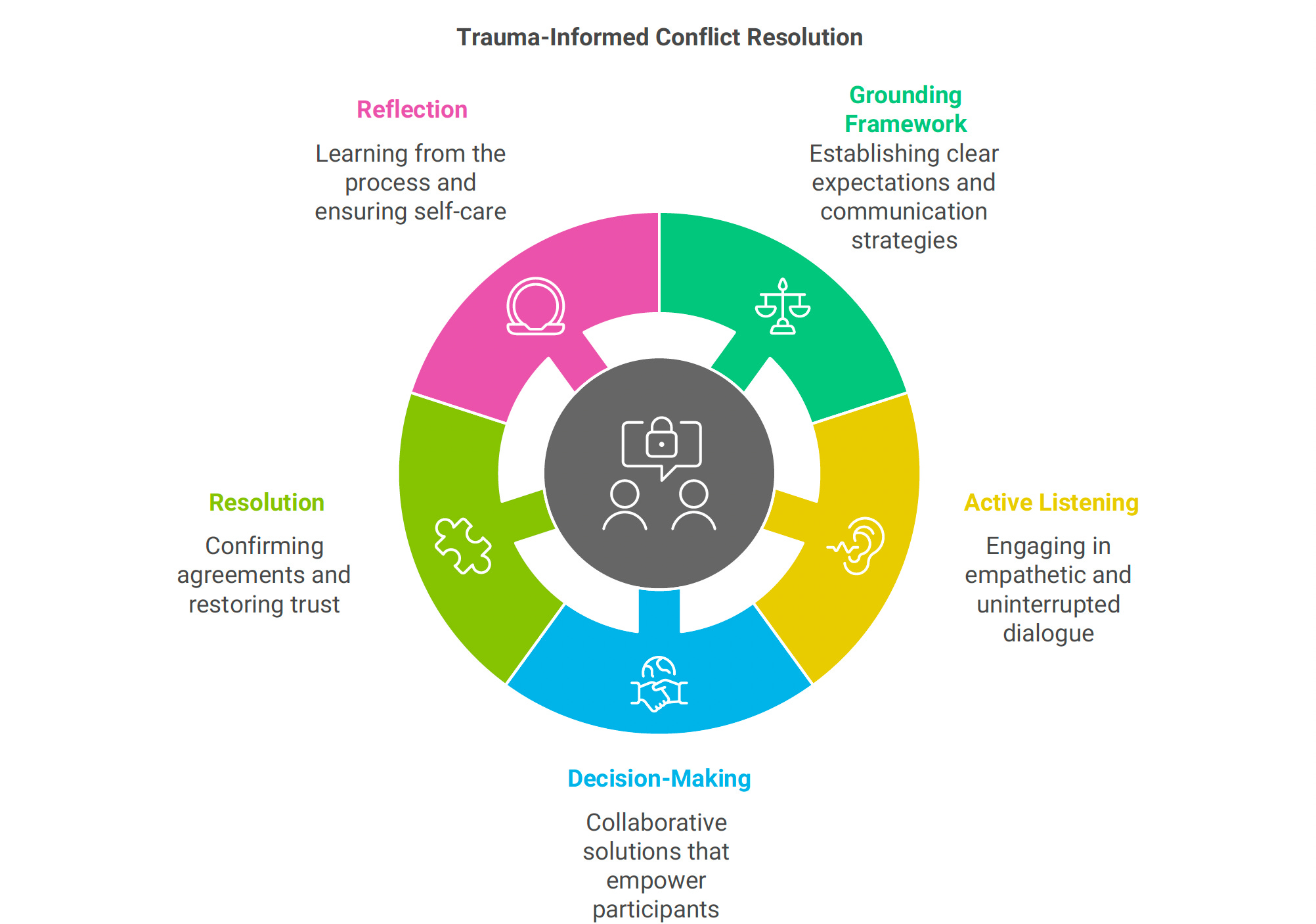 Conflict is an inevitable part of any organization, but how we approach and manage it can make all the difference. When conflicts arise, especially in spaces where people carry the weight of trauma, a thoughtful, trauma-informed strategy is essential. This approach not only helps resolve disputes but also fosters trust, safety, and empowerment within teams and communities. Below, we’ll explore a step-by-step trauma-informed conflict management framework, its real-world application, and the lessons we’ve learned about navigating complex human dynamics.